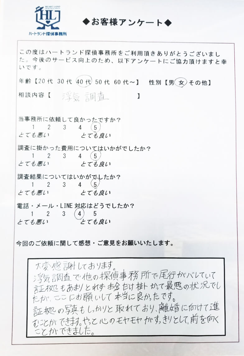 浮気調査で他の探偵事務所で尾行がバレていて証拠もあまりとれずお金だけ掛かって最悪の状況でしたが、ここにお願いして本当に良かったです。