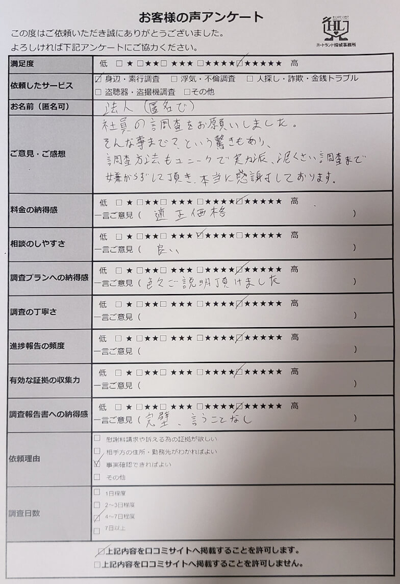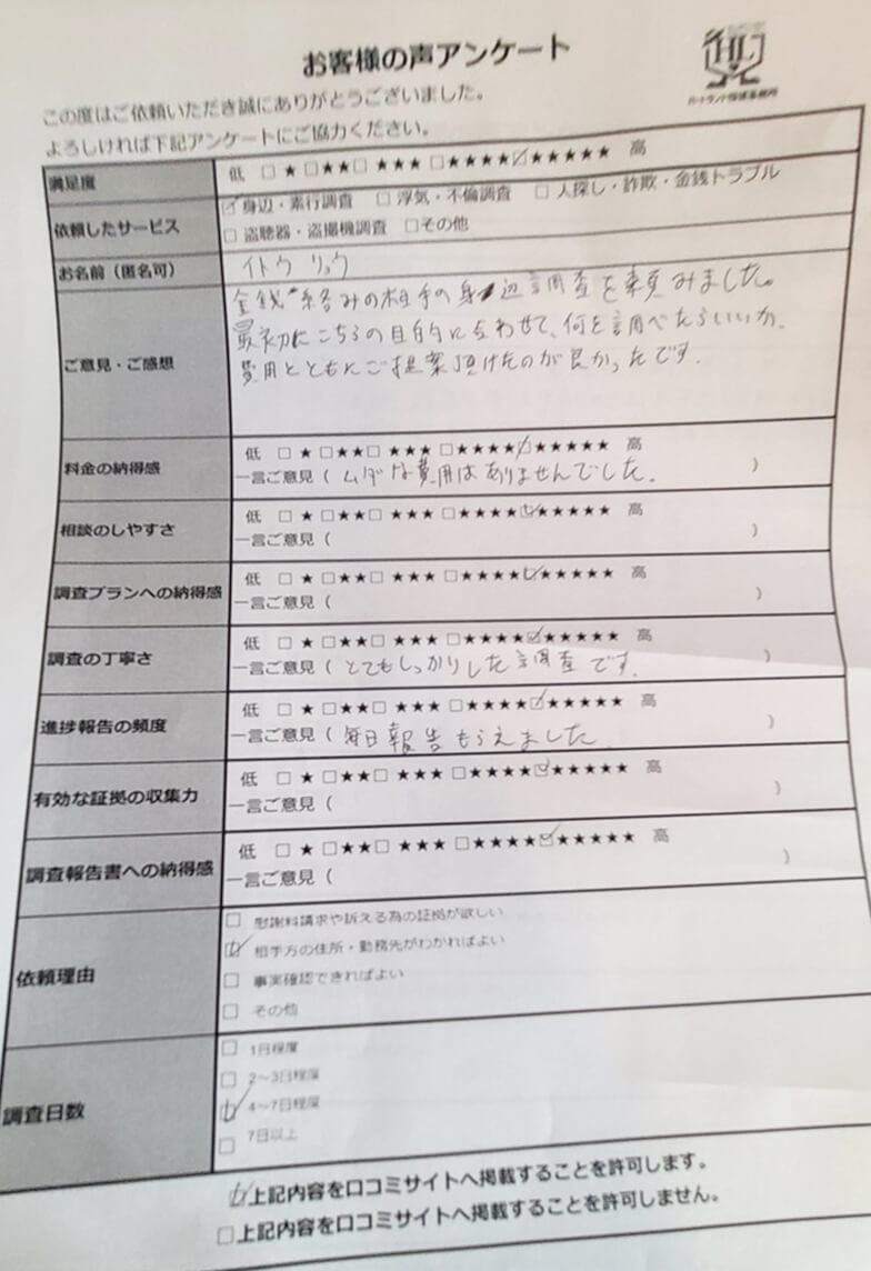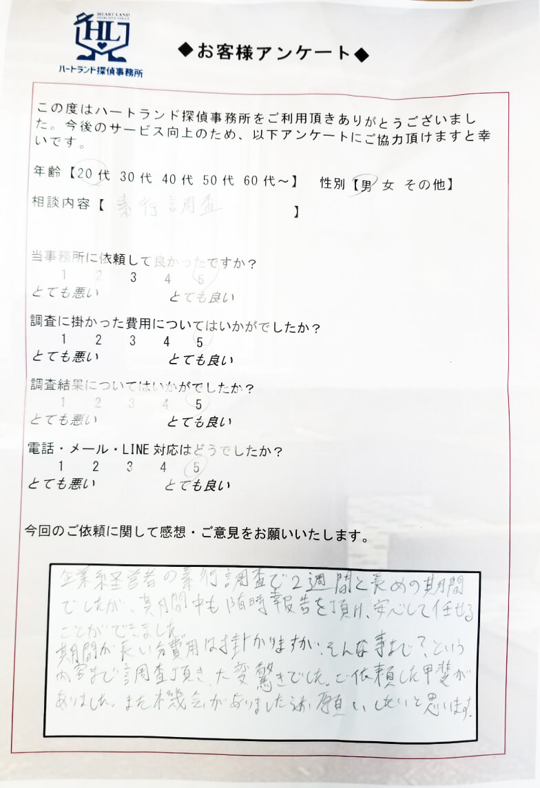 期間が長い分費用は掛かりますが、そんなことまで?という内容まで調査頂き大変驚きでした。ご依頼した甲斐がありました。